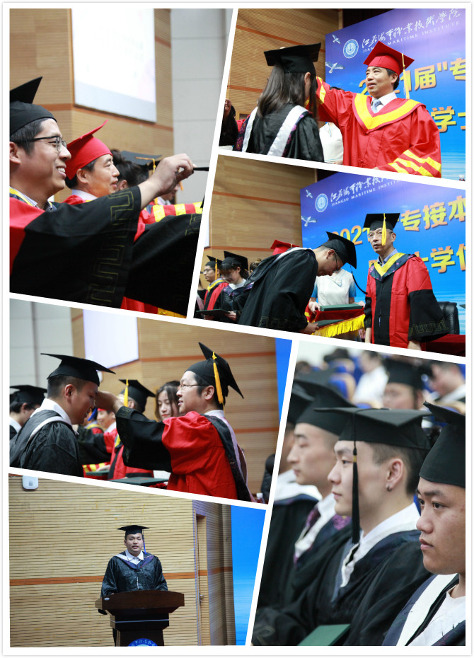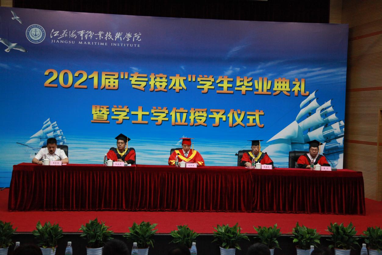 6月11日下午,江苏海事职业技术学院2021届“专接本”毕业典礼暨学士学位授予仪式在图书馆报告厅举行。学校党委书记刘红明、南京财经大学继续教育学院院长秦嘉杭、南京师范大学公共管理学院副院长倪咸林、江南大学继续教育学院副院长李剑等出席典礼,学工处、教务处和各二级学院有关领导及2021届“专接本”应届毕业生和在校生代表参加仪式。毕业典礼和学位授予仪式由继续教育学院院长王松明主持。