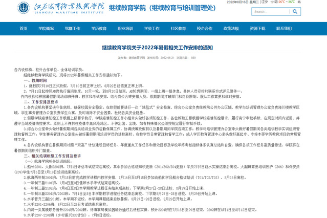 继续教育学院领导班子高度重视暑假工作,在放假前多次召开专题会议定方案、抓细节,提前谋划周密研究部署,确定了暑期工作计划和任务分工,并在校园网和微信公众号公布了《继续教育学院关于2022年暑假相关工作安排的通知》。