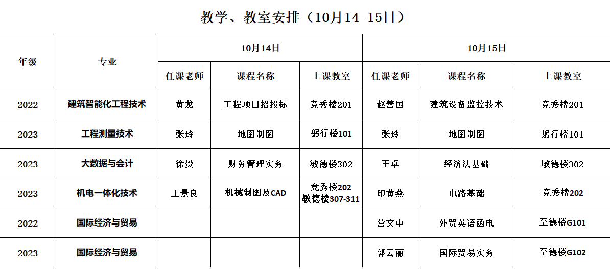 一、本次到校上课共有5个专业,分别为:建筑智能化工程技术、工程测量技术、大数据与会计、机电一体化技术、国际经济与贸易。
