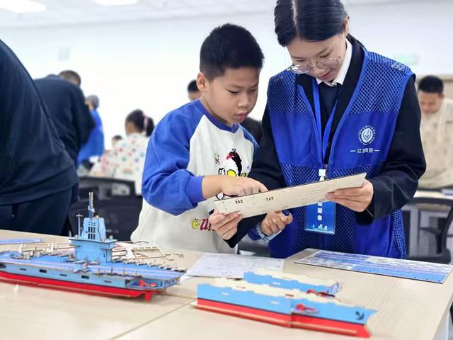 活动还特意设置了“拼装航母模型”环节。玉树路社区为每组家庭提供国产航母模型套件,并搭配图文并茂的拼装说明书与航母知识手册。拿到模型零件后,家长与孩子迅速分工:有的家长负责对照说明书理清拼装步骤,有的孩子则仔细辨认甲板、舰岛、舰载机等细小零件;遇到复杂的拼接处,孩子会主动请教家长,家长则手把手指导孩子调整零件角度,耐心讲解“航母为什么能搭载舰载机”“我国航母发展的重要意义”等知识。经过近一小时的协作,一艘艘威风凛凛地航母模型陆续完成,孩子们小心翼翼地捧着自己的“成果”拍照留念,眼神中充满自豪。