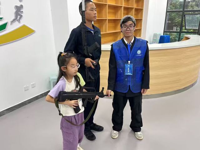 “军事技能展示”板块,更是激发了孩子们的热情。在专业教官的演示下,亲子家庭分组体验“模拟射击”“穿戴防毒面具”“队列正步展示”等项目。孩子们手持模拟步枪,瞄准、射击,动作有板有眼。