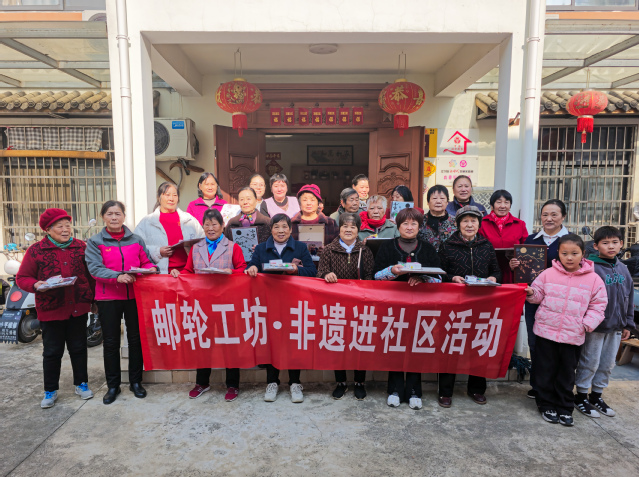 讲座尾声,王楠老师还与居民们一同参与非遗金箔画制作体验。她引导大家将“小雪” 节气的清冷意境融入创作,手把手教大家勾勒线条、粘贴金箔,在指尖的互动中,让老人们感受传统工艺的细腻与雅致。当一幅幅带着金箔光泽的节气画作完成时,大家纷纷拿起作品合影,脸上满是成就感。