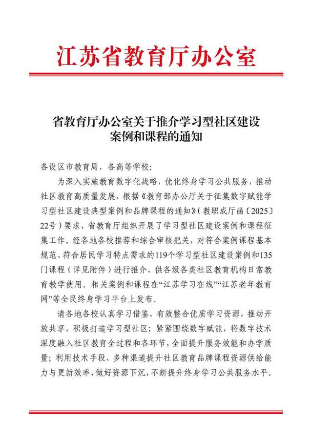 为深入实施教育数字化战略,优化终身学习公共服务,推动社区教育高质量发展,江苏省教育厅依据《教育部办公厅关于征集数字赋能学习型社区建设典型案例和品牌课程的通知》(教职成厅函〔2025〕22号)要求,组织开展了全省范围内的学习型社区建设案例和课程征集工作。经各地各校推荐、省教育厅综合审核把关,最终筛选出119个符合案例基本规范、贴合居民学习特点需求的优秀典型案例予以全省推介,供各级各类社区教育机构日常教育教学借鉴使用,相关案例已在“江苏学习在线”“江苏老年教育网”等全民终身学习平台正式发布。